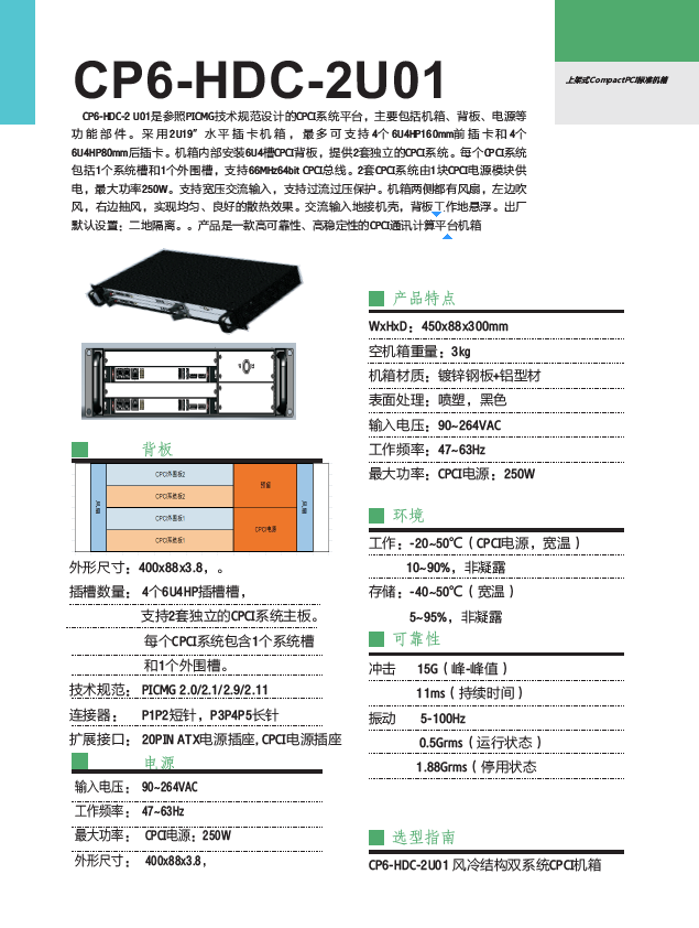 CP6-HDC-2U01是參照PICMG技術規范設計的CPCI系統平臺,主要包括機箱、背板、電源等功能部件。采用2U19”水平插卡機箱,