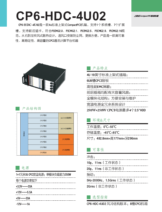 CP6-HDC-4U02是一款4u標準上架式CompactPCI機箱,支持1個系統槽、7個擴展槽,支持前后插卡,符合PICMG2.0、