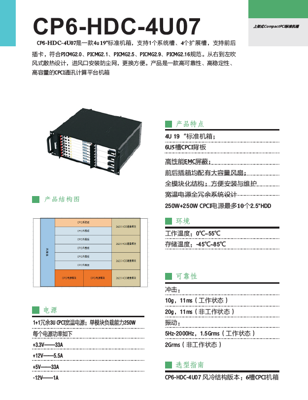 CP6-HDC-4U07是一款4u 19"標準機箱,支持1個系統槽、4個擴展槽,支持前后插卡,符合PICMG2.0、PICMG2.1、