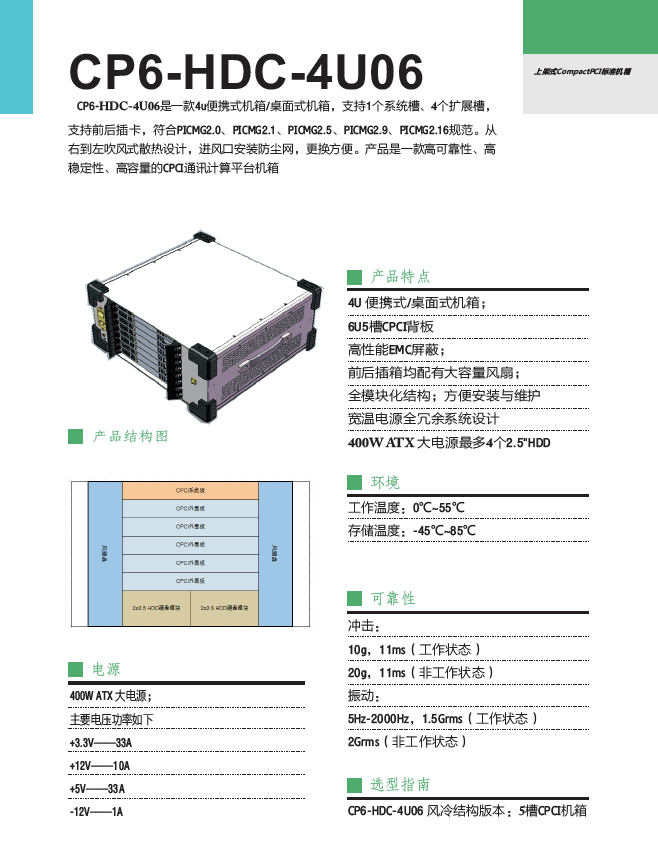 CP6-HDC-4U06是一款4u便攜式機箱/桌面式機箱,支持1個系統槽、4個擴展槽,支持前后插卡,符合PICMG2.0、PICMG2.1、PICMG2.5、PICMG2.9、PICMG2.16規范。從右到左吹風式散熱設計,進風口安裝防塵網,更換方便。產...