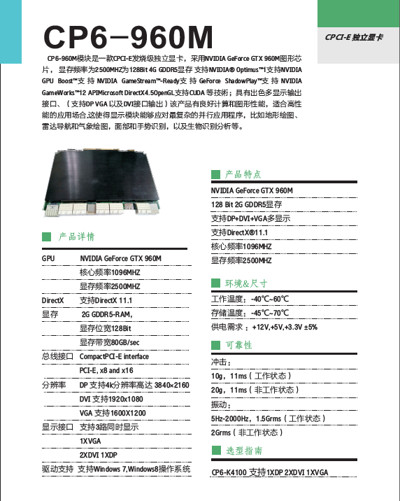 CP6-960M模塊是一款CPCI-E發燒級獨立顯卡,采用NVIDIA GeForce GTX 960M圖形芯片, 顯存頻率為2500MHZ為128Bit 4G GDDR5顯存 支持NVIDIA? Optimus?1支持NVIDIA GPU Boost?支持NVIDIA GameStream?-Ready支持GeFo...