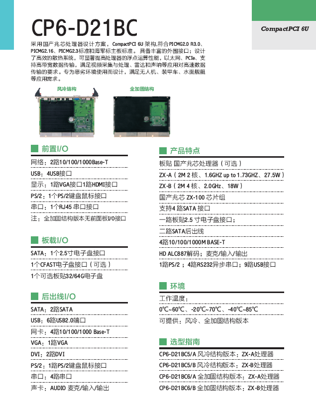 CP6-D21BC采用國產兆芯處理器設計方案,CompactPCI 6U 架構,符合PICMG2.0 R3.0、 PICMG2.16、PICMG2.3標準和海軍標主板標準。 具備豐富的外圍接口;設計 了高效的散熱系統,可顯著提高處理器的浮點運算性能,以太網...