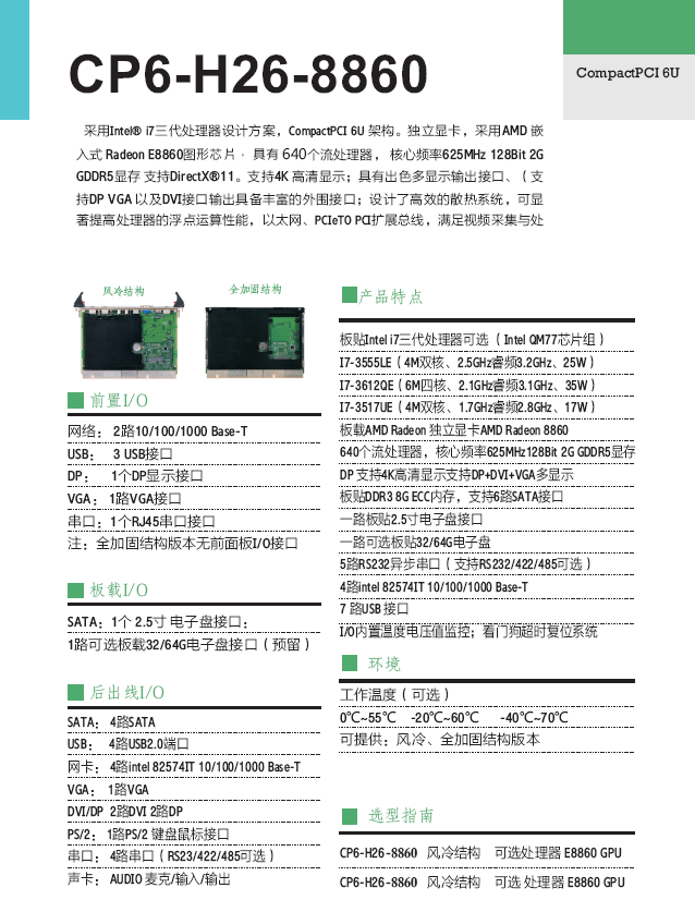 采用Intel? i7三代處理器設(shè)計(jì)方案,CompactPCI 6U 架構(gòu)。板載AMD 嵌入式 Radeon E8860獨(dú)立顯卡,GPU 具有 640個(gè)流處理器, 核心頻率625MHz 128Bit 2G GDDR5顯存 支持DirectX?11。支持4K 高清顯示;具有出色多顯示輸...