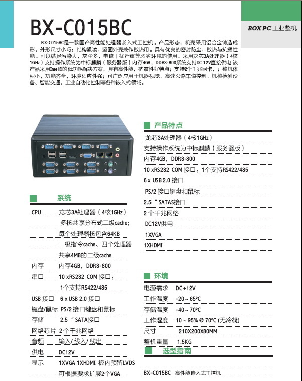 BX-C015BC是一款國產龍芯3A高性能處理器嵌入式BOX PC 工控機。產品形態(tài),機殼采用鋁合金鑄造成形,外形尺寸小巧;結構緊湊、堅固外殼兼作散熱用。具有優(yōu)良的密封防塵、散熱與抗振性能。可以滿足污染大,灰塵多,...