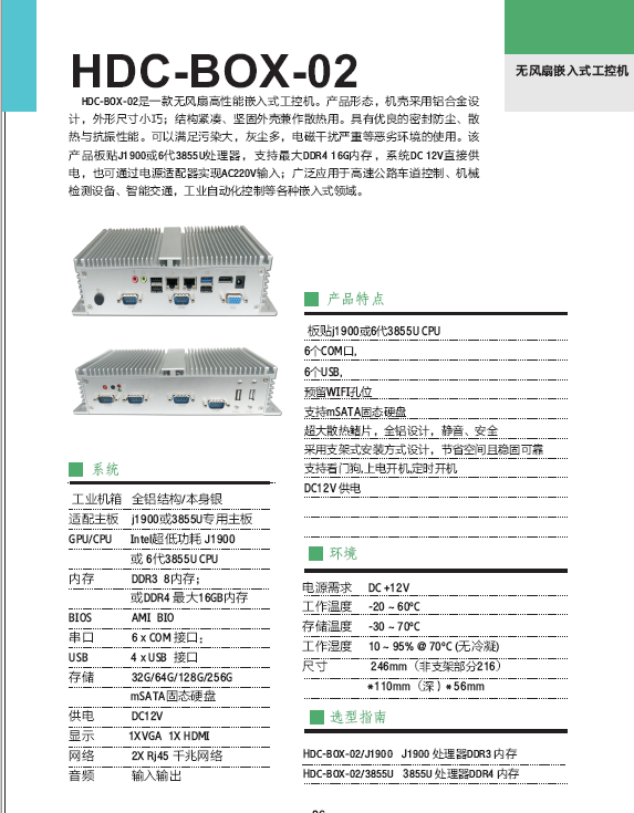 HDC-BOX-02是一款無風扇高性能嵌入式工控機。產品形態,機殼采用鋁合金設計,外形尺寸小巧;結構緊湊、堅固外殼兼作散熱用。具有優良的密封防塵、散熱與抗振性能。可以滿足污染大,灰塵多,電磁干擾嚴重等惡劣環境...