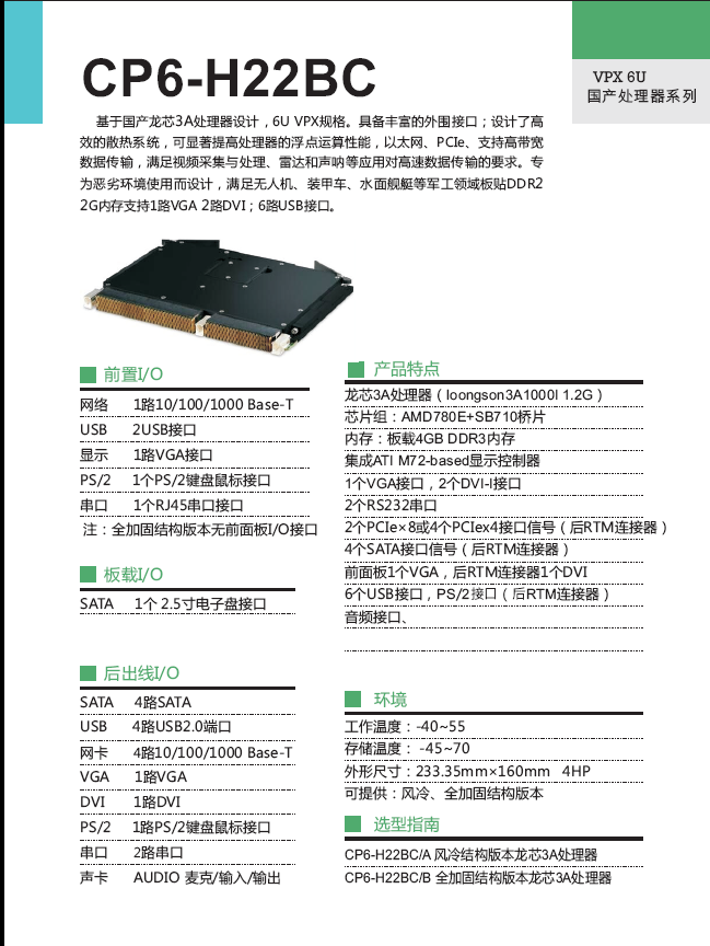 基于國產龍芯3A處理器設計,6U VPX規格。具備豐富的外圍接口;設計了高