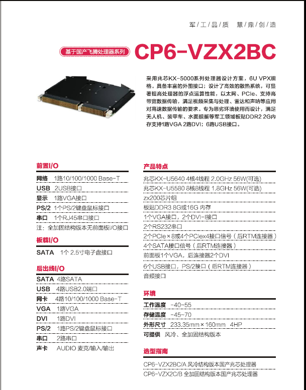 基于兆芯KX-5000系列處理器設計,6U VPX規格。具備豐富的外圍接口;設