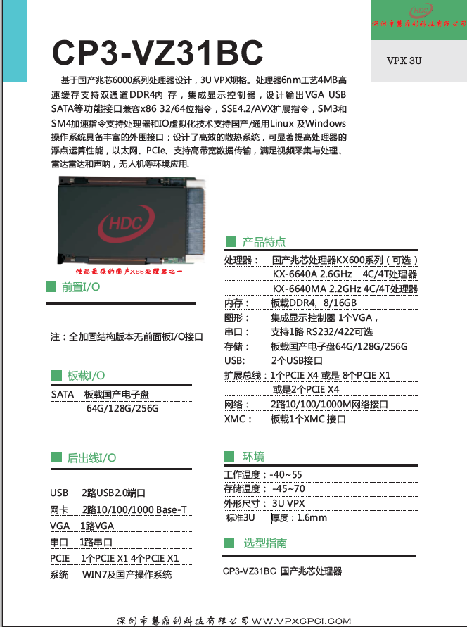 基于國產兆芯6000系列處理器設計,3U VPX規格。處理器6nm工藝4MB高 速緩存支持雙通道DDR4內 存, 集成顯示控制器, 設計輸出VGA USB SATA等功能接口兼容x86 32/64位指令,SSE4.2/AVX擴展指令,SM3和 SM4加速指令支持...